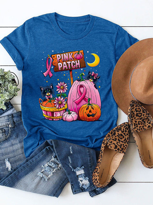 Pink Patch Graphic Pink Ribbon Round Neck T-shirt