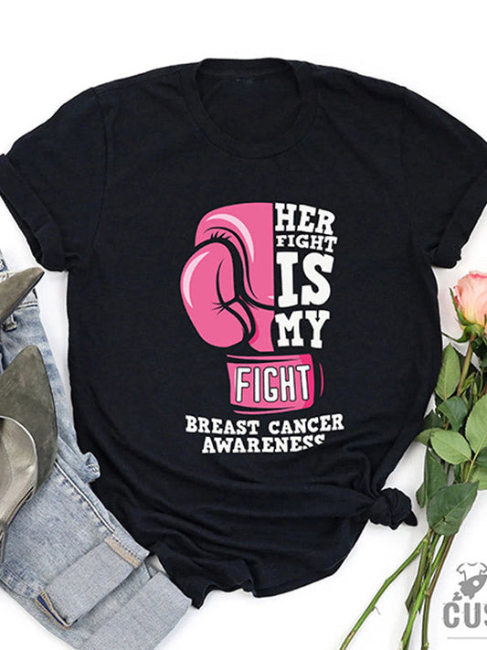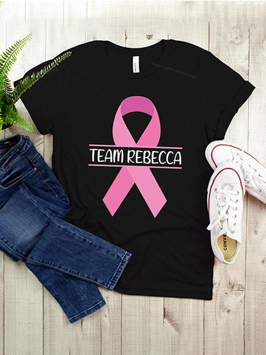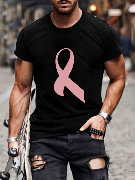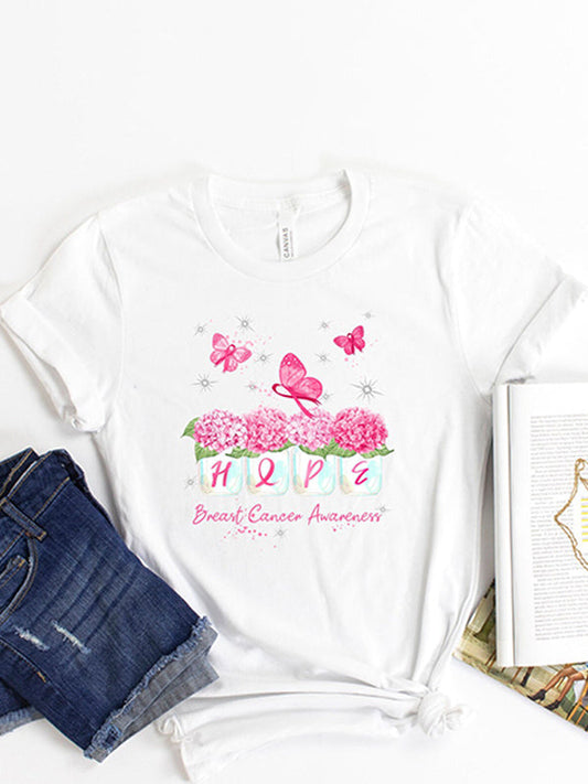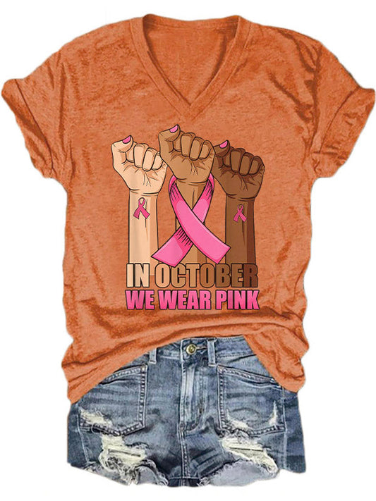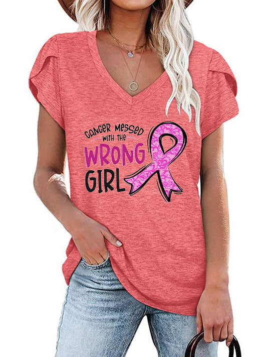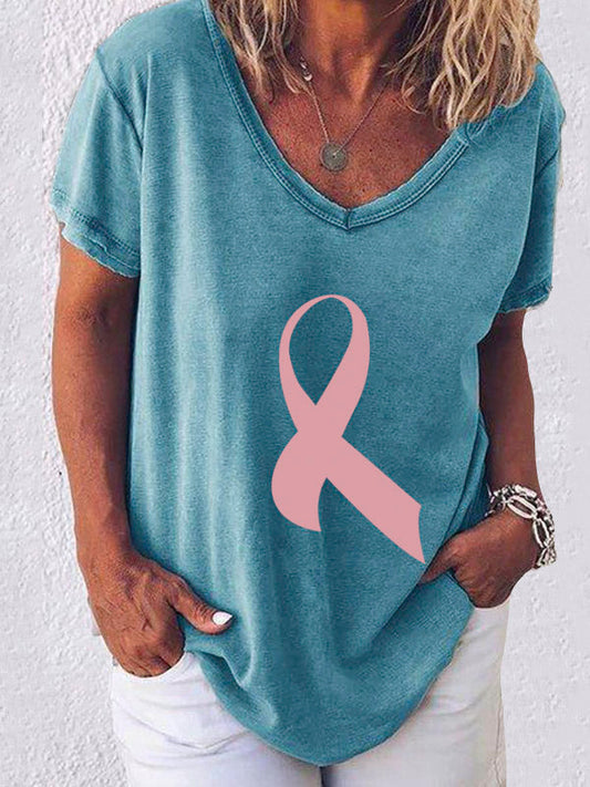 Pink Ribbon Print V-neck Short Sleeve T-shirt