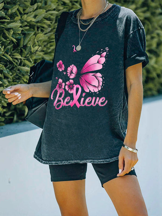 Believe Pink Ribbon Butterfly Graphic Washed T-shirt