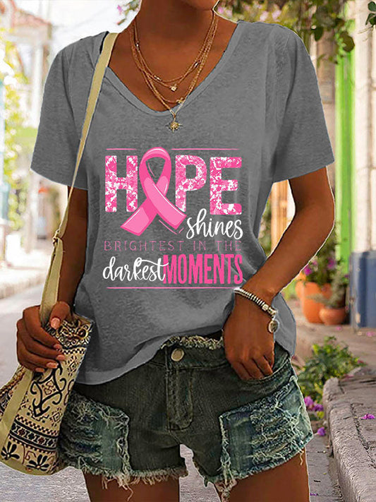 Hope Shines Pink Ribbon V-neck Short Sleeve T-shirt