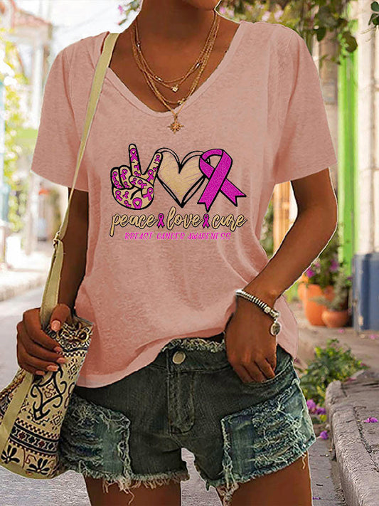 Peace Love Cure Pink Ribbon V-neck Short Sleeve T-shirt