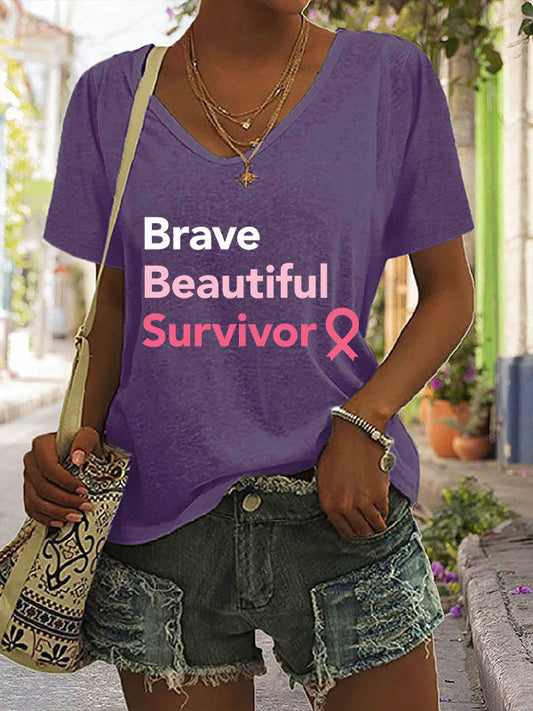Brave Beautiful Survivor Pink Ribbon V-neck Short Sleeve T-shirt