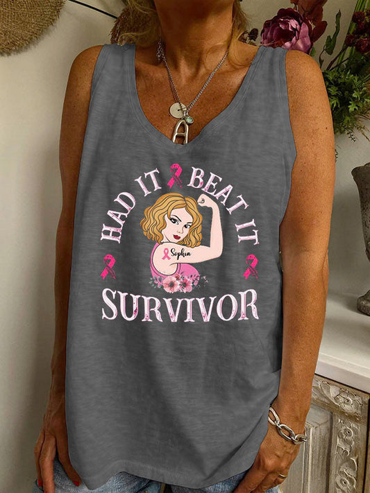 Had It, Beat It, Survivor Pink Ribbon Graphic V-neck Loose Tank