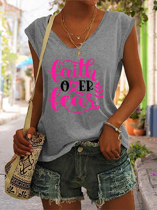 Faith Over Fear Pink Ribbon Print V-Neck T-Shirt