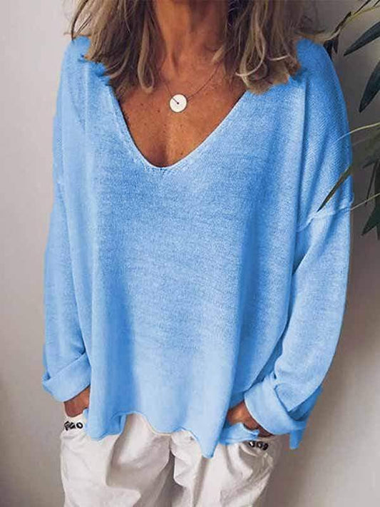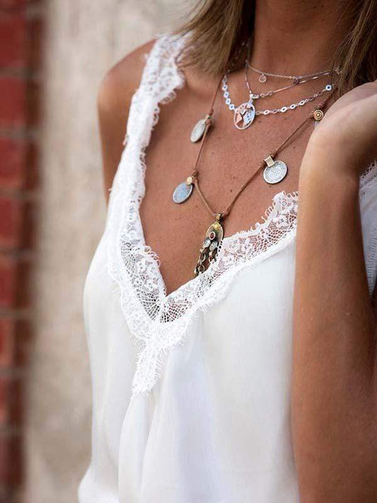 Deep V Neck Patchwork Lace Plain T-Shirts