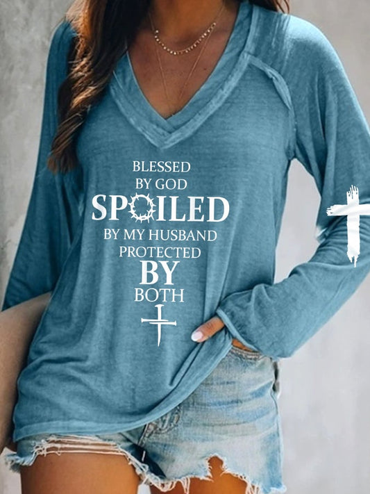 Blessed By God Spoiled By My Husband Protected By Both V-Neck Long Sleeve T-Shirt